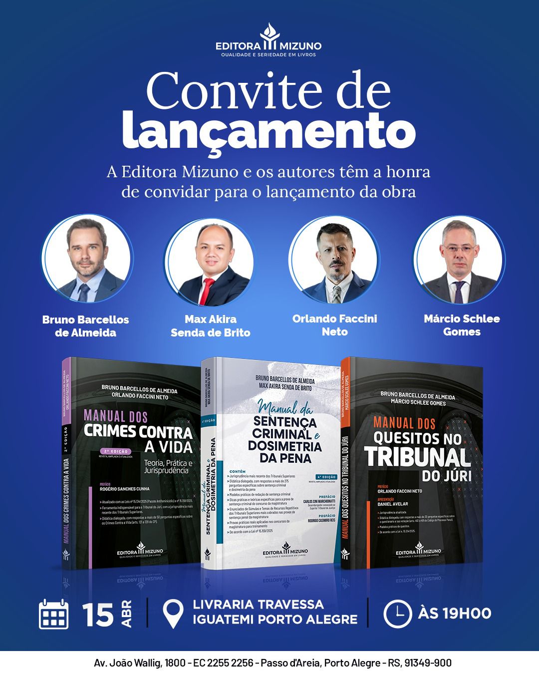O lançamento dos quatro livros ocorrerá a partir das 19h do dia 15 de abril, na Livraria Travessa do Shopping Iguatemi (Avenida João Wallig, 1800, piso 2). As obras são publicadas pela Editora Mizuno.